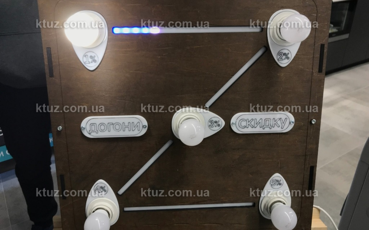 Также, хотим обратить внимание, что на стенде, все элементы декора (надписи) съемные и мы можем подготовить под ваши задачи любые надписи. То есть, можно генерировать с помощью велосипеда не только скидки, но и любые другие еденицы измерения - балы, бонусы и т.д.
