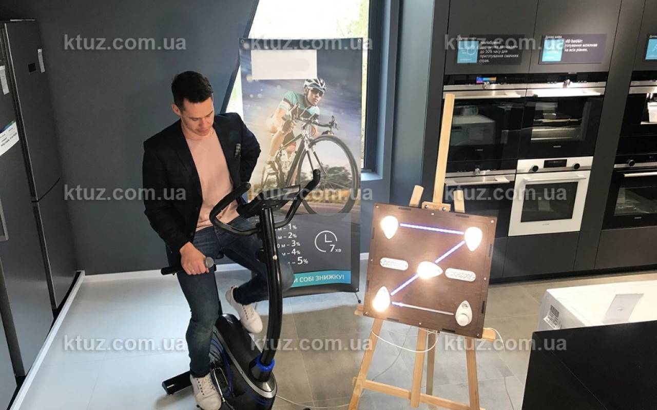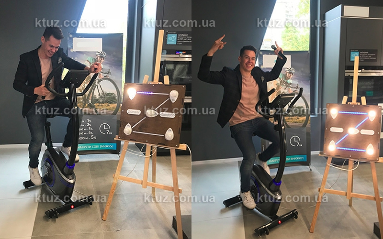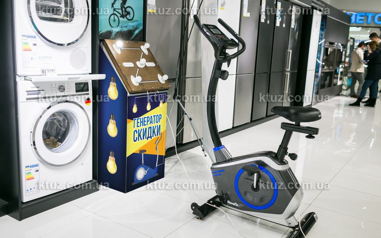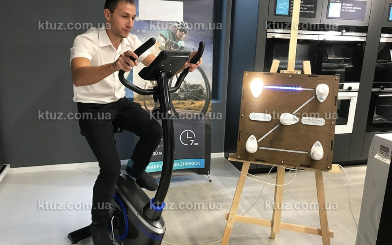 Это отличный способ разыграть среди клиентов скидку в 5 шагов. Самому выносливому достанется самая большая скидка. Мы сделали весь путь длиною в 1750 метров или, примерно, 5 минут езды. Всего на стенде есть 5 лампочек, которые постепенно загораются по мере преодоления участников дистанции. Между лампочками идет светодионая лента, которая визуализирует процесс прохождения дистанции. Это удобно и красиво =)
