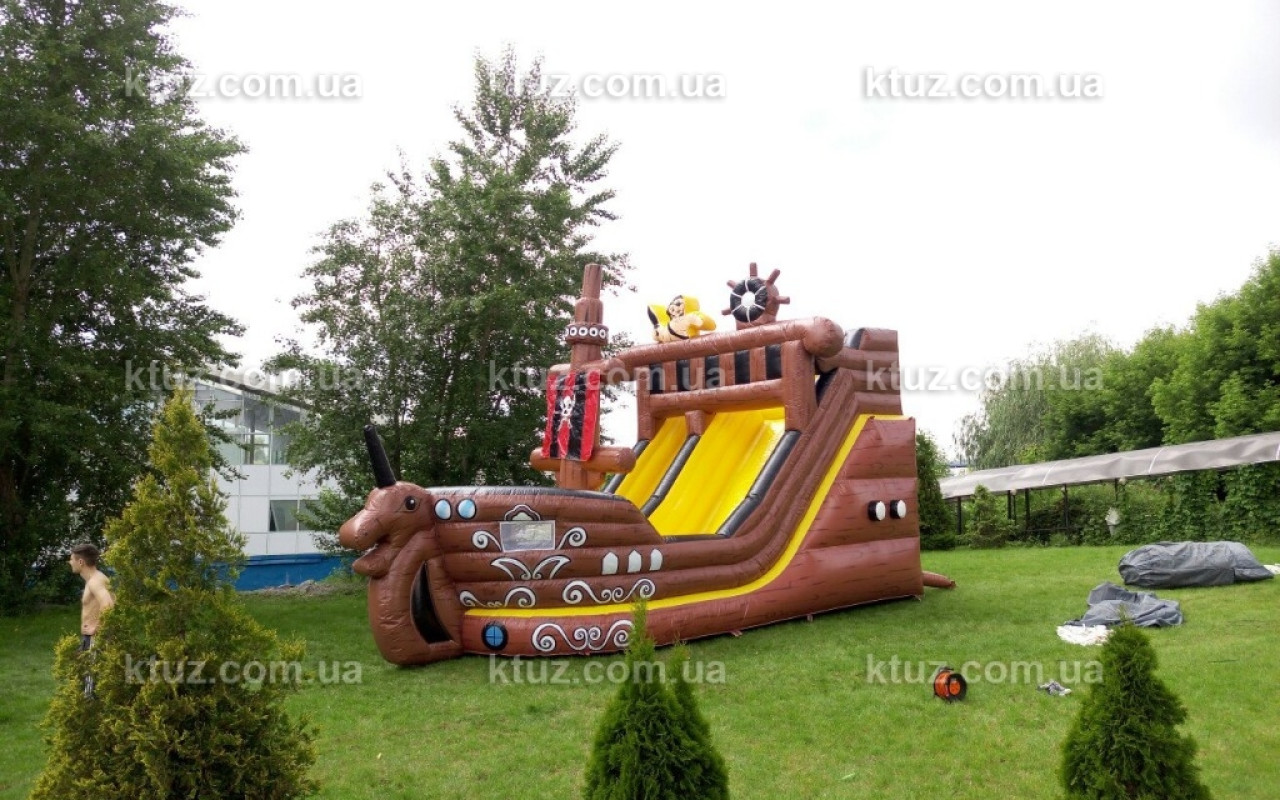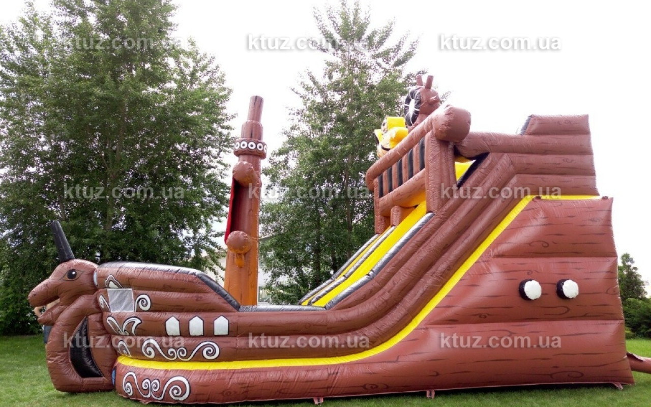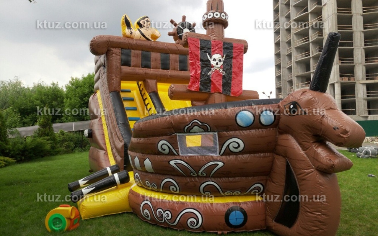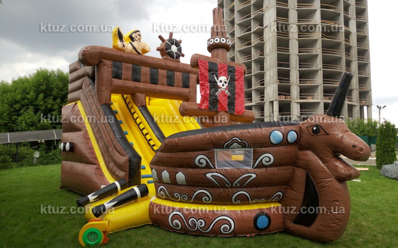 Батут-горка изготовлен в виде прекрасного старинного корабля пиратов, где есть даже сундук с сокровищами! Снаружи батут украшен надувными пушками, что подчеркивает эффект пиратского судна. Наш аттракцион создан из прочных материалов с двойным прошитием. Это гарантирует безопасность использования. Очень важно, чтобы аттракционы для детей были абсолютно безопасны, и мы всегда следим за качеством нашего оборудования.