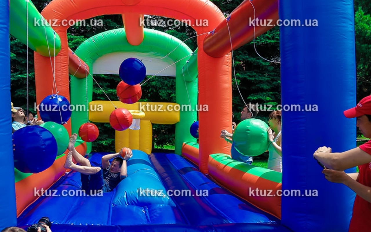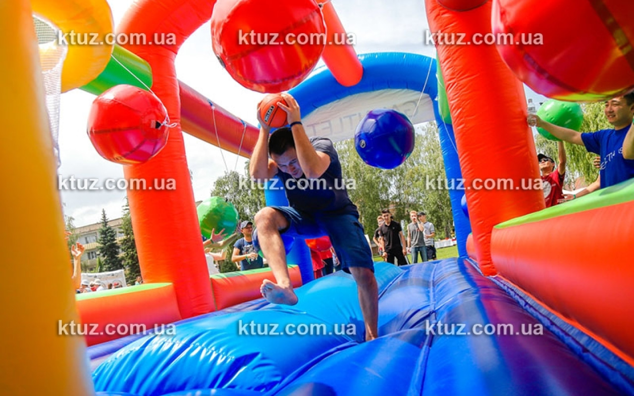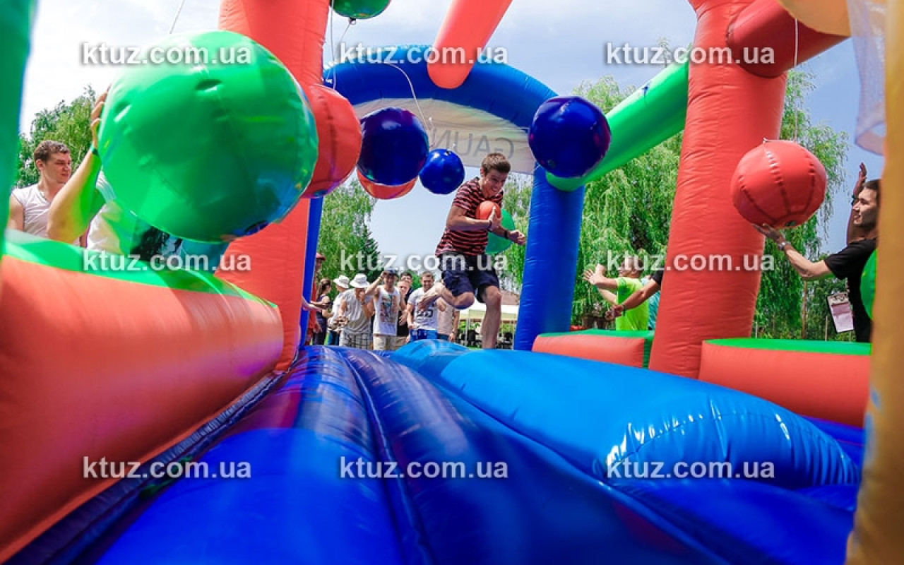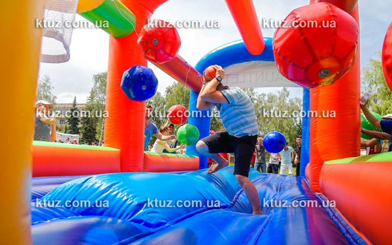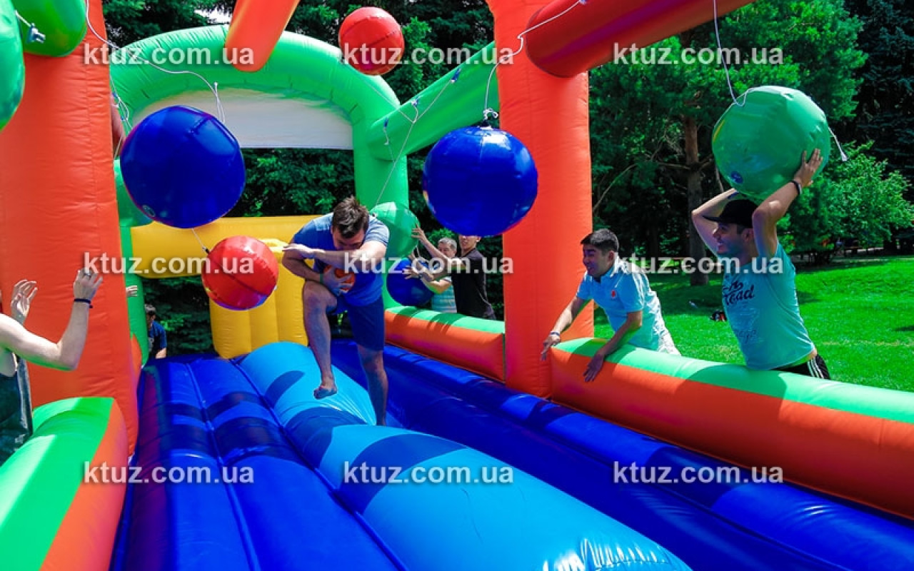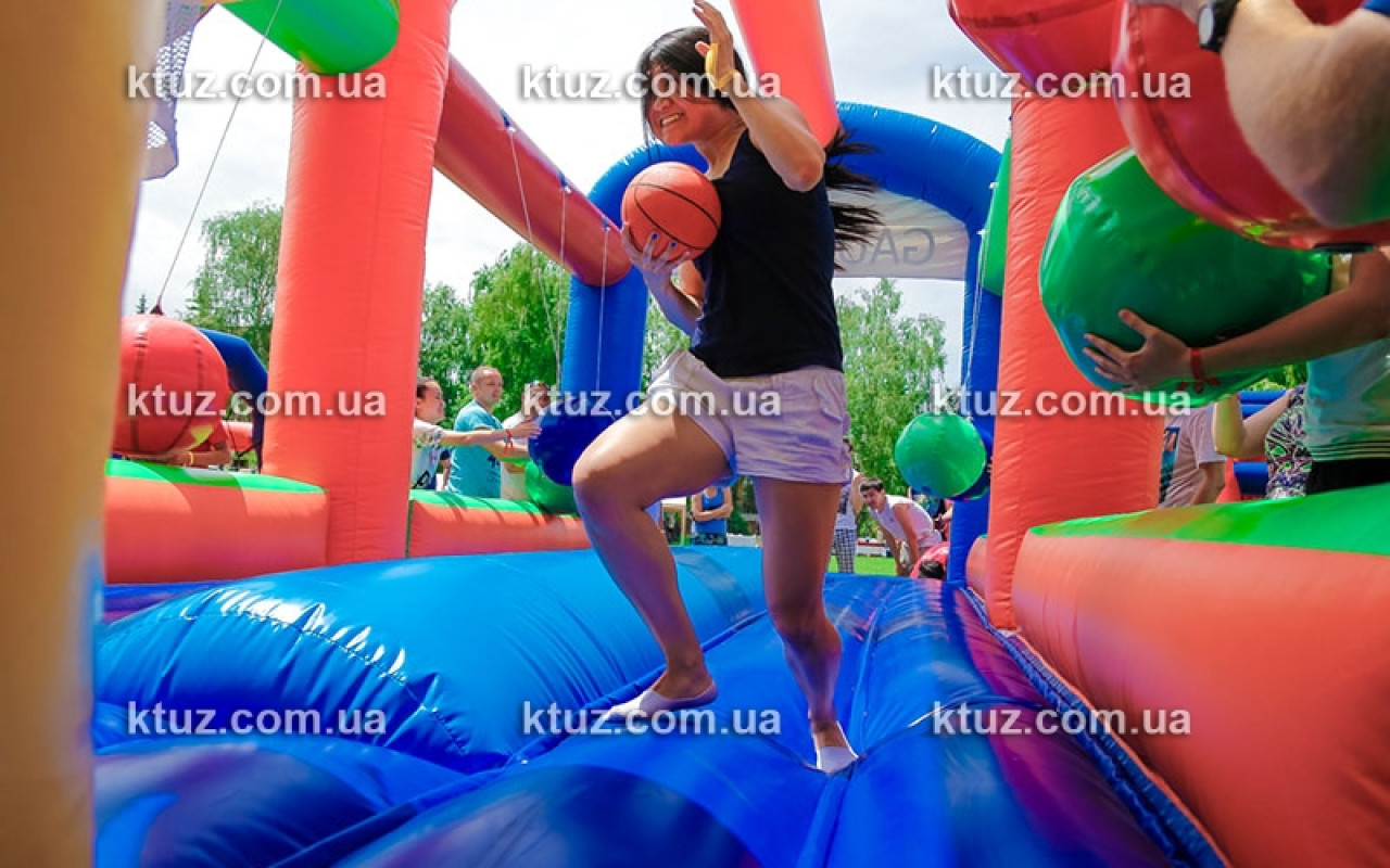 Простое задание осложняется действиями"конкурентов". На пути к заветной цели подвешены 6 бочонков (из мягкого поролона). Возле бочонков размещаются члены команды-соперника. Их цель - помешать "конкуренту". Они стараются сбить игрока, сталкивая его бочонками с батута. Падение на мягкий надувной пол абсолютно безопасно, риск получить травму сведен к нулю. А вот веселье и азарт для обеих сторон обеспечены.