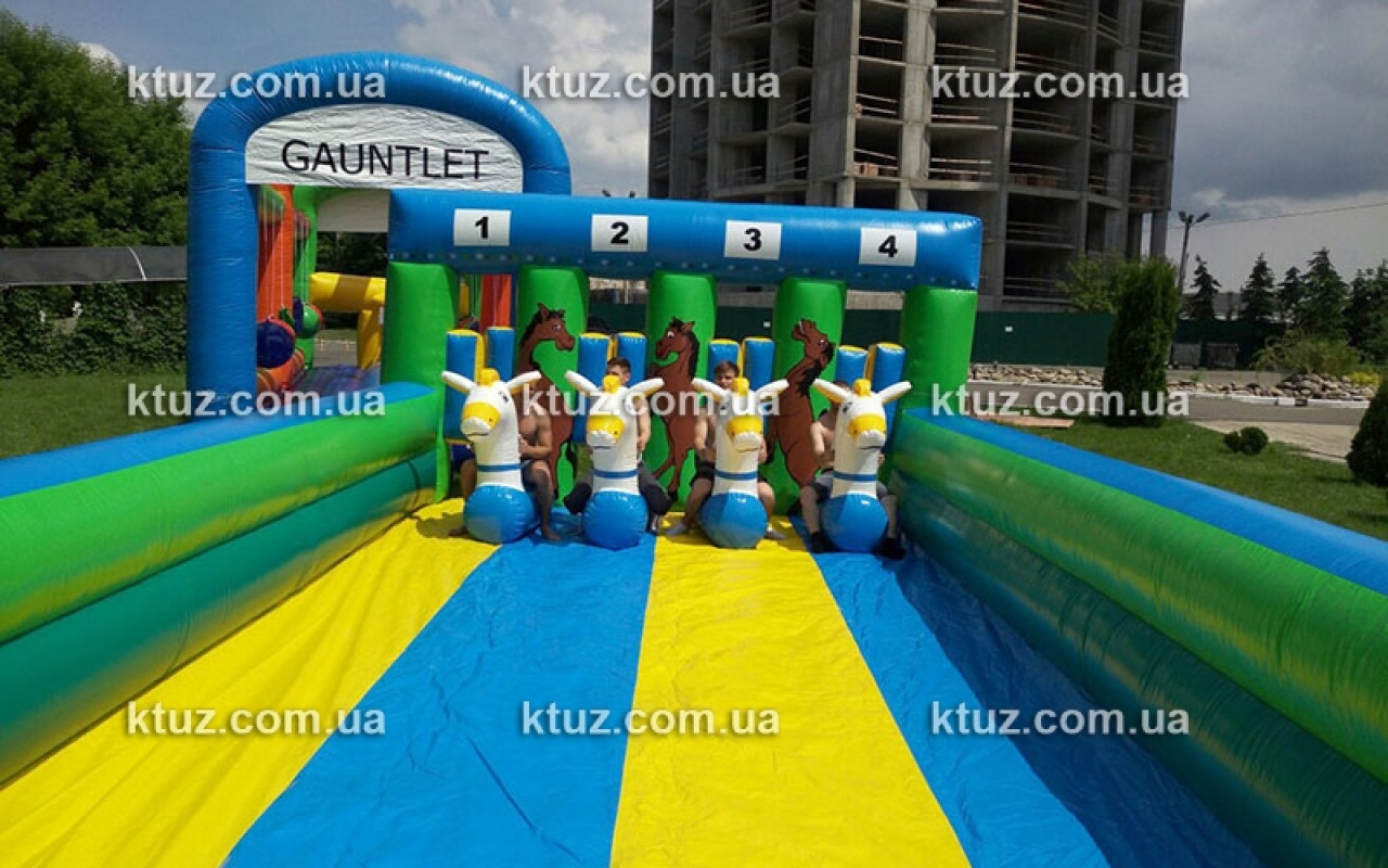 Надувные конные скачки позволяют провести массу увлекательных конкурсов для друзей и сотрудников. Например, Вы можете организовать одиночные или командные соревнования. При сольном конкурсе, где каждый игрок борется за победу самостоятельно, нужно пересечь поле от старта до финиша или проскакать на лошади до противоположной стороны и обратно. При командных состязаниях задание можно усложнить. Например, один участник скачет на лошадке до противоположной стороны, держа в руках эстафету. Здесь игрока ждет следующий член команды, который должен перехватить эстафету, сесть на коня и проскакать на нем обратно. Игра продолжается ровно до тех пор, пока каждый игрок не пройдет эстафету.