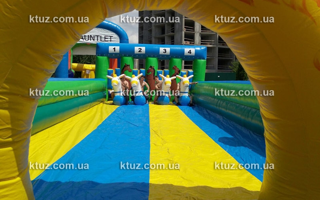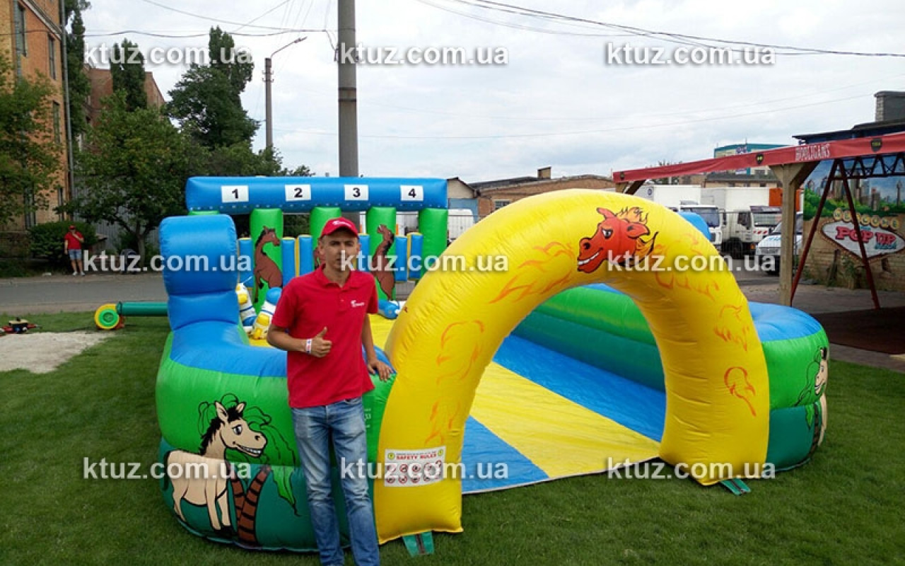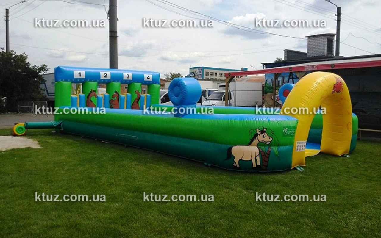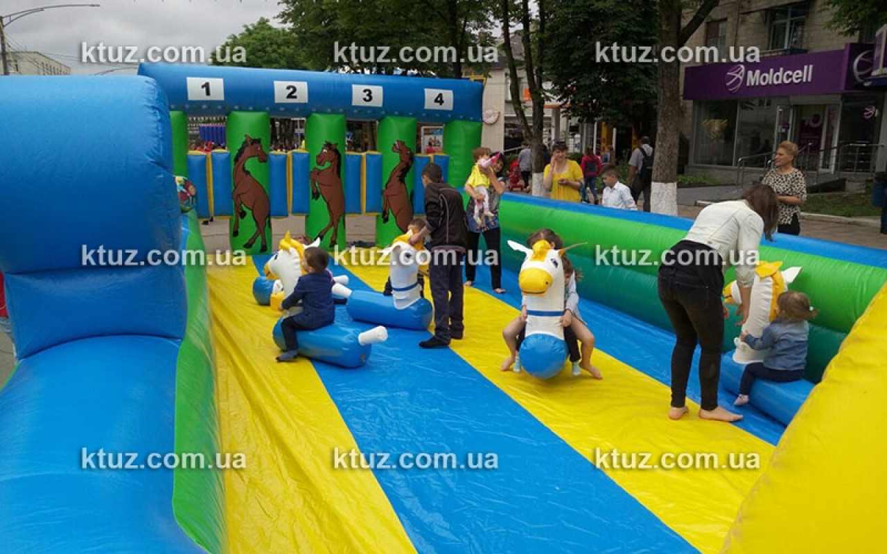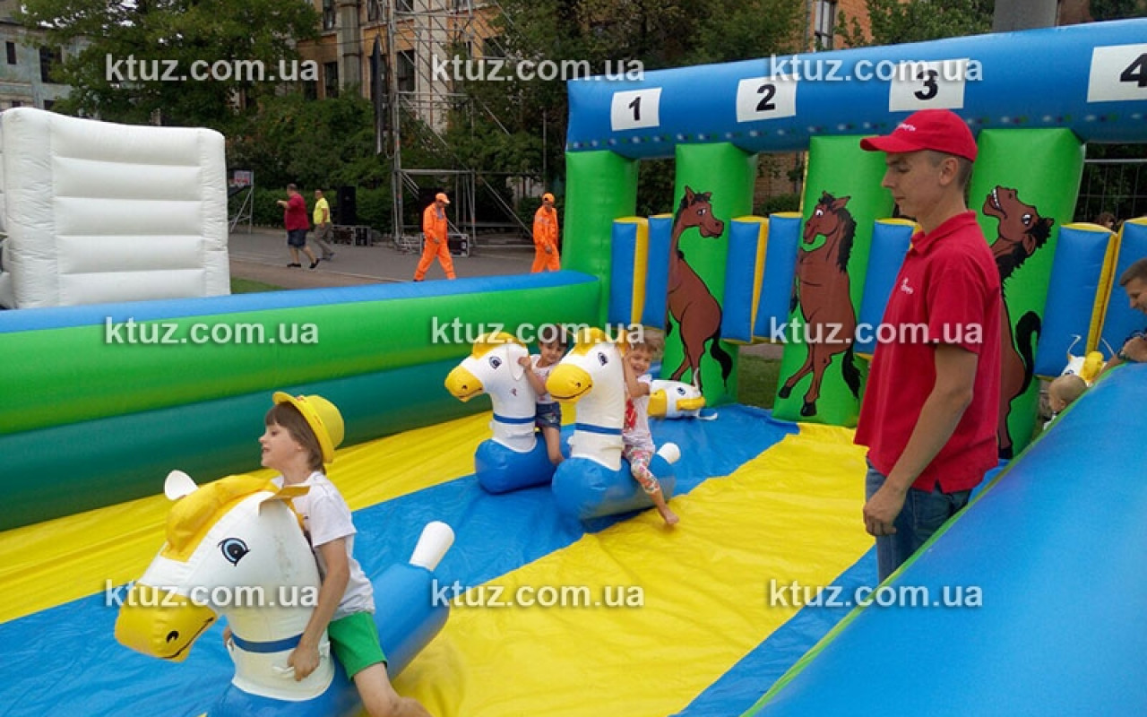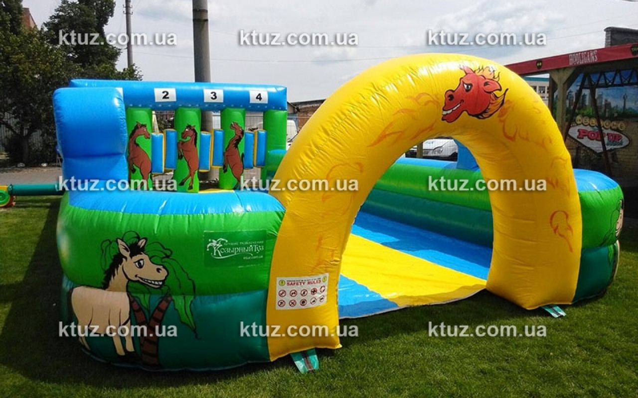 Новая услуга компании Козырный Туз для летних мероприятий: день рождения, тимбилдинг, корпоратив, детский праздник или частная вечеринка. Надувной ипподром с надувными лошадьми обеспечит проведение шикарных скачек на празднике. Как выглядит наш аттракцион? Скачки на надувных лошадях – это специальное поле с надувными стенками, стартом и финишем. На поле устанавливаются забавные надувные лошадки, на которых и нужно будет скакать.