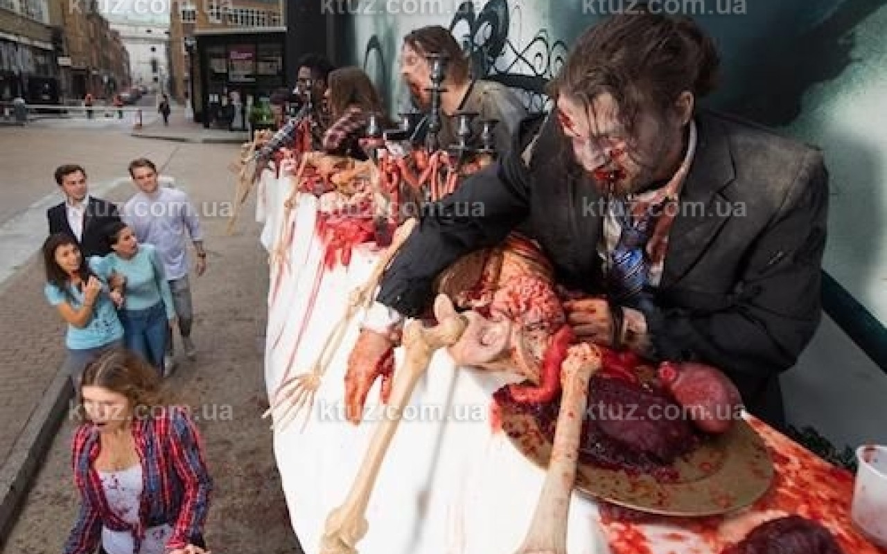 Что же придумали креативщики промо-агентства? На биллборде - машина, наполненная внутренностями животных, а "настоящие" зомби их жуют, бросают в прохожих, пугая их. Зомби могут и "слазить" с биллборда и начать прогулку по ближайшим улицам. Необычный подход к продвижению аттракционов, как планируют креативщики из агентства, должен привлечь внимание потенциальных клиентов.