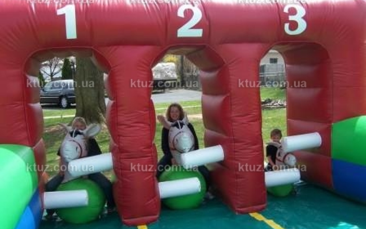 4. Скачки на надувных лошадях. Аттракцион является аналогом настоящего Дерби, но проводится на мягком поле, а норовистыми скакунами в игре являются надувные лошади. Четверо всадников пускаются вскачь, пытаясь не только удержаться в седле на пружинящем скакуне, но и обогнать других наездников. Скачки сопровождаются падениями, прыжками и прочими неуклюжими и смешными пируэтами, принося море радости как самим участникам соревнования, так и благодарной публике.