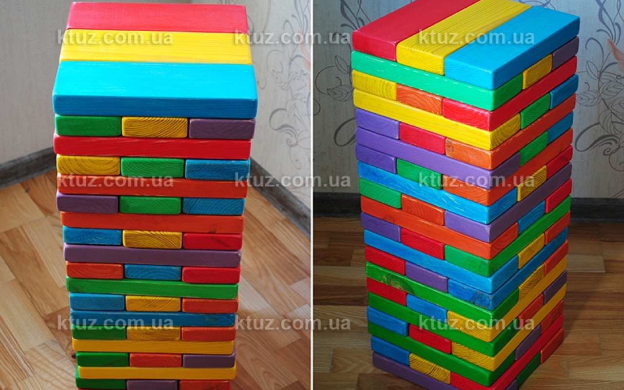 Такой вариант известной игры понравится всем, от 4 до 80 лет. Суть игры остается неизменной: нужно вытягивать нижние бруски и складывать их на верх. Но теперь у каждого игрока может быть свой цвет. И правила становятся сложнее.
