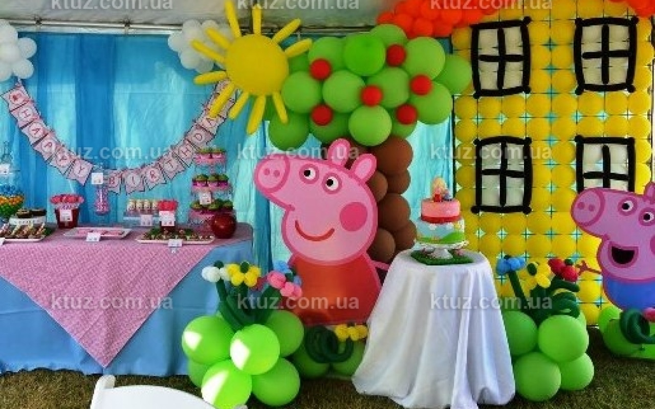 Декорировать помещение можно разноцветными шарами, растяжками из флажков, большими рисунками с животными, занавесками нежных пастельных тонов. Прекрасным украшением праздничного интерьера станет хижина свинок, паровозик дедушки Свина, мультяшные деревья и другой антураж. В обязательном порядке в помещении оборудуется фотозона: здесь расставляют картонные фигурки героев мультфильма в полный рост с вырезанными лицами, уголок драпируется полотном кремового или фисташкового цвета, украшается шариками и цветами.