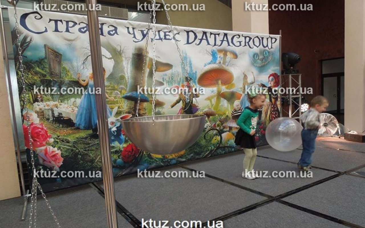 Для праздника в стиле Зазеркалье подойдут и оригинальные баннера. Здесь будут изображены картины из фильма «Алиса в стране чудес», например, сцена про чаепитие. Расставленные по всему залу баннера, создадут атмосферу Зазеркалья.